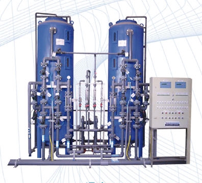 混床是混合离子交换柱的简称,是针对离子交换技术所设计的设备。所谓混床,就是把一定比例的阳、阴离子交换树脂混合装填于同一交换装置中,对流体中的离子进行交换、脱除。由于阳树脂的比重比阴树脂大,所以在混床内阴树脂在上阳树脂在下。一般阳、阴树脂装填的比例为1:2,也有装填比例为1:1.5的,可按不同树脂酌情考虑选择。混床也分为体内同步再生式混床和体外再生式混床。同步再生式混床在运行及整个再生过程均在混床内进行,再生时树脂不移出设备以外,且阳、阴树脂同时再生,因此所需附属设备少,操作简便。